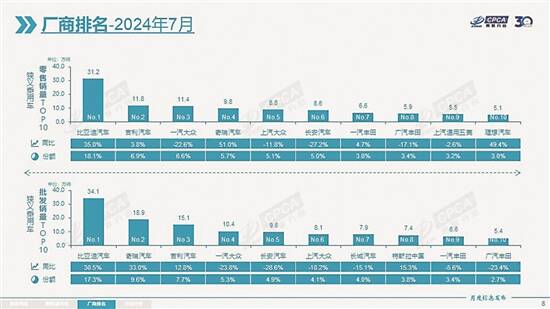 羊城晚报记者 戚耀琪 乘联会最新统计显示,7月内部有效需求相对不足,居民消费预期不强,但近期国家“以旧换新”的乘用车报废更新政策逐步见效、各地相应政策措施出台与跟进,政策推动下的消费潜力释放效果很好。7月新能源车走势好于乘用车厂商预期。 传统车企品牌份额提升明显 在首购群体规模下降和新能源车冲击带来的传统燃油车市占率下降后,由于购车人群变化和新能源渠道的变化,市场季节性节奏减弱。 7月30日召开的中共中央政治局会议明确:要强化行业自律,防止“内卷式”恶性竞争。强化市场优胜劣汰机制,畅通落后低效产能退出渠道。部分品牌努力在经销商利益和销量预期之间寻求理性和审慎,因此价格竞争动力减弱,用户观望情绪减少,有力地维护了市场预期。 具体来说,7月乘用车环比增速下降2%,是近期最小降幅。市场价格拐点出现,恶性价格竞争苗头被抑制。主流自主车企持续走强,新势力表现分化,新能源车国内零售渗透率达到51.1%,实现首次月度突破50%,较去年同期36.10%的渗透率提升15个百分点。7月一共卖了87.8万辆新能源车,而燃油车只卖了84.2万辆,实现首次月销量超越。 7月自主品牌零售106万辆,同比增长13%,环比增长3%。当月自主品牌国内零售份额为61.8%,同比增长8.5个百分点;2024年自主品牌累计份额57%,相对于去年同期增长7.2个百分点。头部传统车企转型升级表现优异,比亚迪、奇瑞汽车、吉利汽车、长安汽车等传统车企品牌份额提升明显。 7月主流合资品牌零售44万辆,同比下降25%,环比下降8%,其中,德系品牌零售份额17.6%,日系品牌零售份额12.9%,美系品牌市场零售份额5.8%,豪华品牌零售份额12.5%,同比下降0.9个百分点,传统豪华车市场零售份额相对稳定。 今年总体汽车出口延续去年强势增长特征。7月海关统计汽车出口55.3万辆,同比增长26%,环比增长14%。 中国插混占世界插混市场78% 7月乘用车主力厂商总体表现分化,比亚迪、奇瑞汽车、吉利汽车、长安系厂商总体较强。7月万辆以上销量的乘用车厂商共32家(6月35家,去年同期31家),占整体市场份额95.30%,其中同比增速超50%的有2家,同比增速超10%的有8家,同比负增长的19家。万辆以上批发量的乘用车厂商环比正增长的有10家,其中环比增长10%以上的有4家,部分自主和新势力的环比表现较强。 7月新能源乘用车生产达到93.3万辆,市场零售87.8万辆,同比增长36.9%,环比增长2.8%。今年1-7月零售498.8万辆,同比增长33.7%。7月B级电动车销量20.5万辆,同比增长43%,环比下降4%,占纯电动份额41%。 7月乘用车批发销量超2万辆的车型有15个(上月17个),排位在前的有:比亚迪宋55128辆、Model Y 41405辆、比亚迪秦40600辆、海鸥36256辆、秦L32941辆。 乘联分会对国内乘用车新能源渗透率突破50%的原因作了多维思考:中国制造业不断强大带来的产业链优势的赋能,装备制造业和零部件产业的电池、电机、芯片等具有超强优势;中国车企创新性的发展插混技术,实现狭义插混和增程式的技术突破,丰富了世界新能源发展的技术线路,取得中国插混占世界插混市场78%份额的突破性优势。7月份国家实施乘用车报废更新政策,纯电插混等较常规燃油车补贴高出0.5万元,进一步助力新能源汽车发展;综上措施推动着7月淡季车市的新能源车渗透率超过了50%。 7月国内零售中,自主品牌中的新能源车渗透率73.9%;豪华车中的新能源车渗透率27%;而主流合资品牌中的新能源车渗透率仅有8.3%。从月度国内零售份额看,7月主流自主品牌新能源车零售份额70%,同比下降2个百分点;合资品牌新能源车份额4.2%,同比下降1.3个百分点;新势力份额19.0%,小米汽车等品牌拉动新势力份额同比增长4个百分点;特斯拉份额5.3%,同比增加0.4个点。