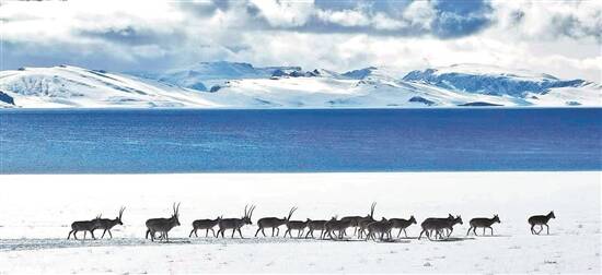 当下,正是去可可西里旅行的最佳季节。每年七、八、九月份也是可可西里无人区藏羚羊的生育季节,藏羚羊会大批集中在可可西里深处的卓乃湖等湖畔待产。图为成群的藏羚羊正迁徙穿越“色林措”湖。