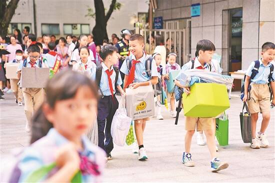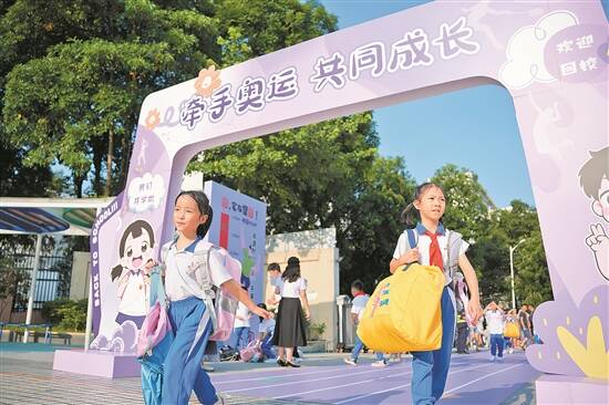 羊城晚报记者 何宁 王沫依 蒋隽 崔文灿 9月2日,广州全市3839所中小学幼儿园开学,253.57万名学生开启新学年。不少学生发现,不管是硬件设施还是教材,都焕然一新。与此同时,各所学校都准备了好玩有趣的游戏环节,让同学们快乐开启新学期。 新学年:学校开启各具特色的“第一课” 在广州市天河区汇景实验学校开学仪式上, 特色活动“赤心向党,赓续前行——赤心国旗护卫队入校开展开学第一课”成为典礼的亮点,这是一支由天安门仪仗队和国旗班退役人员组成的专业团队。活动展示了2023年9月1日在天安门广场升起的国旗,退役队员深情讲述关于它背后的故事。 华南师范大学附属小学为一年级新生们举行了开笔礼。孩子们整齐地排列着,他们认真地整理自己的衣冠,不仅仅是对外表的打理,更是对心灵的洗礼,正衣冠代表着对学习的尊重与期待。朱砂开智环节,老师们用笔蘸着朱砂,在孩子们的额头上轻点一颗红痣,象征着开启智慧之门,让智慧的光芒照亮他们的学习之路。 广大附小开学第一课主题为“牵手奥运,共同成长”。记者在二年级5班教室看到,师生们热烈讨论着暑假观看奥运会的感受。林意桐同学表示,她印象深刻的是乒乓球比赛,她被樊振东顽强拼搏的精神所感动,“我也要像奥运冠军那样为了自己的梦想坚持不懈。” 在小北路小学,巴黎奥运会跆拳道49公斤级亚军郭清“空降”现场,分享自身经历,鼓励孩子们遇到困难时“永远要坚持下去”;广州市培文外国语学校则在校长樊瑞的带领下用火炬传递的形式开启新学期大幕,让阳光奋进的精神洒满校园。 新“硬件”:上新校区、更新设施,各区“大显身手” 据悉,新学年有不少区纷纷增加优质学位。记者从白云区教育局了解到,今年秋季新学期白云区共将新启用8所幼儿园以及5所义务教育阶段学校(校区),共新增超万个优质学位。其中今年复办的颜乐天纪念中学将提供初高中共计514个公办学位,黄边小学则开办了第三个校区——乐得校区,一年级计划招收6个班级共270名学生。 海珠区今年上新了一所小学——广州市海珠区宝玉直实验第二小学,首批92名一年级新生昨日迎来了开学。 广州汇景实验学校的华园校区也于今年9月迎来第一批学生。新校区位于天河区东莞庄路239号,占地面积18000多平方米,是一所九年一贯制学校,可为周边社区提供优质学位1680个。2024学年在一年级和七年级各开设四个班,共计在读311名学生。 黄埔区新开办公办学校(校区)共有6所,新增优质学位超过1万个。这些学校包括黄埔军校纪念中学北校区、苏元学校东校区、新港小学南校区、铁铮学校东校区、开元学校西校区、夏园小学新校区、华南师范大学附属中学知识城小学、黄埔区实验小学等。 花都区迎来广州市第六中学第三个校区——花都校区初中部,此外还上新了广州市花都区空港学校小学部、广州市花都区邝维煜纪念中学附属小学、广州市花都区新华四小附属珑华小学、广州市花都区新雅街尚雅小学(清潭校区)等校。 今年9月南沙区将新开办3所公办小学,分别为华南师范大学附属南沙凤亭小学、广州市南沙区东盛小学和广州市南沙区万新小学,办学规模分别为36个、48个以及30个教学班。 此外,还有学校利用暑假对原有设施进行升级,为学子们提供更好的环境。如广州市铁一中学在假期升级了番禺校区;广州市第二中学(科学城校区)对初中高中宿舍床铺、行李架等设施全部更新,规划更加科学;广州市第十六中学则将负一层空间改造成特色餐厅,原乒乓球馆将规划改造为新的立体图书馆,增设了阅读区、讨论区等多个功能区。 新“软件”:小学中学起始年级启用新教材 新学期,起始年级学生用上了“新教材”。开学首日,记者在广州大学附属小学看到,一年级学生的《道德与法治》《语文》《科学》《数学》等教材封面都注明“国家教材委员会专家委员会审核通过2024”字样。根据教育部办公厅今年7月25日发布的关于印发《2024年义务教育国家课程教学用书目录(根据2022年版课程标准修订)》的通知,根据2022年版义务教育课程标准修订的教材将于2024年秋季学期陆续投入使用。根据计划,义务教育三科统编教材将于三年内覆盖所有年级。其中,2024年秋季学期小学一年级和初中一年级使用;2025年,小学一、二、三年级和初中一、二年级使用;2026年,义务教育阶段所有年级全部完成替换。 新教材在内容上有哪些变化呢?广州大学附属小学一年级语文老师张超梅表示,从新版的一年级语文教材来看,更符合实际的学情。主要体现在以下三个方面: 一是选文发生了变化。新增加了《我爱我的祖国》《两件宝》等课文,删去了《画》《大小多少》等课文,从低年段开始加强爱国主义教育以及劳动教育。 二是延长拼音学习时间。新教材中拼音教学由两个单元调整为三个单元,教学时间比原来增加1至2周,减缓了起始阶段的学习坡度,以帮助学生更好的掌握拼音。延长了拼音学习的时间,也夯实学生的拼音基础。 三是降低了教材难度,做好幼小衔接。张超梅老师表示,新教材整体难度有所下降:“我们可以观察到课文后面本学期的识字表,由原先需要认识300个汉字、会写100个汉字,到现在的认识280个汉字、会写100个生字,一年级上册的课文从14篇减少到10篇、识字课从10课缩减至8课,整体降低难度,这让学生能够更快地适应小学生活。总体