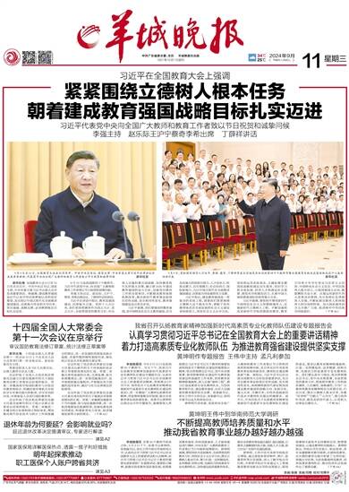中共广东省委主管、主办 羊城晚报社出版 1957年10月1日创刊 2024年9月11日 星期三 甲辰年八月初九 34℃ 25℃ 责编/袁婧 美编/刘栩