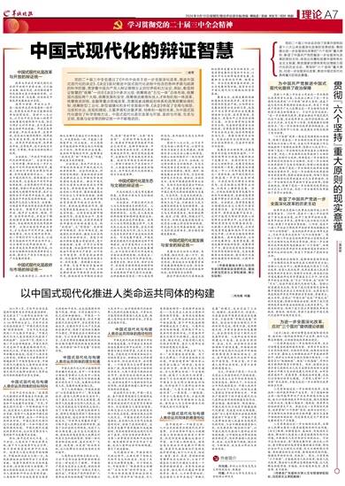 □史军 党的二十届三中全会通过了《中共中央关于进一步全面深化改革、推进中国式现代化的决定》。《决定》是对推进中国式现代化进程中包含的各种矛盾与规律的科学把握,贯穿着中国共产党人辩证唯物主