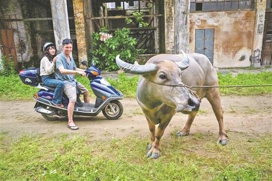 《炉底糍就是华夫饼》拍摄过程中,一头悠然的水牛和骑着摩托车的男女主角相遇,一种魔幻现实感扑面而来 |