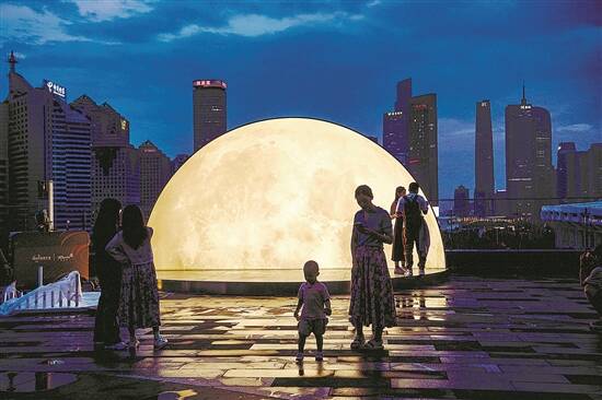 广州天河区天河路某商场楼顶,一个巨大的“人造月亮”景观吸引了众多市民前来打卡拍照,同赏明月,共度佳节 羊城晚报记者 贺全胜 摄