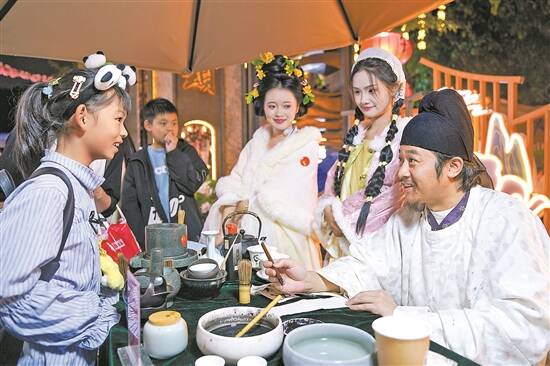 4日,在四川省成都市东门码头,夜游锦江项目推出的“锦夜庆华诞·璀璨耀蓉城”国庆系列主题活动上,“李白”(右)与小朋友互动对诗 新华社发 |