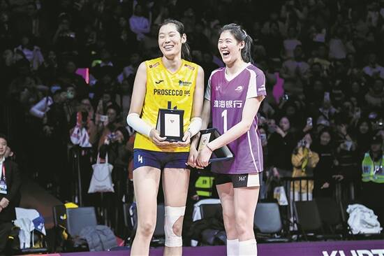 朱婷(左)和李盈莹同时获得赛事最佳主攻,两人在颁奖仪式上笑得很开心 图/视觉中国 |