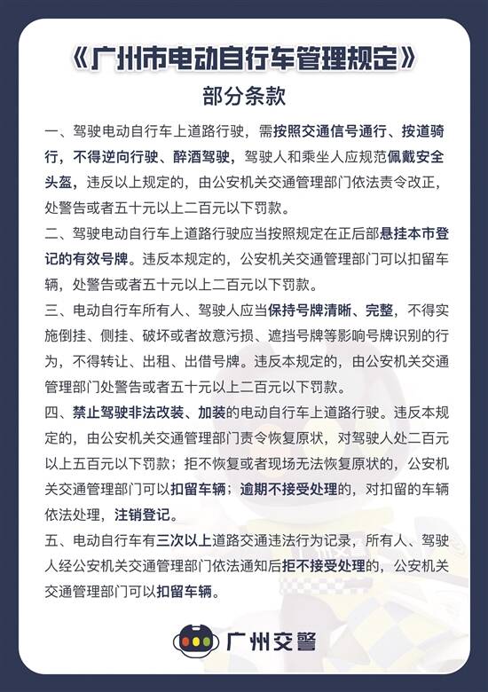 文/羊城晚报记者 郭思琦 柳卓楠 图/羊城晚报记者 柳卓楠 “您好,《广州市电动自行车管理规定》将于本月30日起实施。未悬挂号牌上路的车辆,交警部门可以依法扣留。”这是广州交警在路面开展宣传劝导的一幕。只见执勤交警一边对“电鸡”车主的交通违法行为依法处罚,一边将新规的宣传单递给车主发出提醒。 为了加强“电鸡”管理,不断优化交通出行环境,日前,《广州市电动自行车管理规定》(以下简称“新规”)正式发布。新规将于2024年12月30日起施行,届时广州将加大力度查处非法改装、无牌上路等交通违法行为,进一步规范“电鸡”通行,同时为明年召开的十五运会营造良好的交通环境。 新规实施在即,广州是如何开展新规宣传的?市民对新规知晓度如何?日前,记者走进社区街道、“电鸡”车行、路面街头等场所和区域,一探究竟。 交警走上街头派传单 “宣传+整治”双管齐下 12月25日中午,记者来到广州市天河区黄埔大道西与体育东路交叉口。现场,“电鸡”通行流量大,不乏外卖小哥、上班族骑“电鸡”出行的身影。多名执勤交警在路面派发宣传单,向车主宣传新规内容;同时,对违法的“电鸡”车主依法处罚。 “您好,请靠边停车,您刚才没有按规定车道行驶。”只见广州市公安局交通警察支队天河大队温警官拦停一辆“电鸡”,并对其违法行为依法处罚。 “同时,您也没有佩戴头盔,电动自行车新规下周一(12月30日)就要实施了,届时不戴头盔将依法处警告或者50元以上200元以下罚款。”温警官将新规的宣传单递给他并提醒。该车车主认真读着宣传单上的内容,坦言以后一定会注意。 刚处理完一单,迎面又驶来一位“电鸡”车主。原本没戴头盔的他,看到执勤交警,迅速将挂在车上的头盔戴了起来。 “戴头盔是为了您的安全,不应抱有侥幸心理。”执勤交警以未佩戴头盔为切入点,耐心劝导车主,“过几天,广州市电动自行车新规就要实施了。新规实施后,交警部门对未佩戴头盔的车主不仅仅是劝导,还将处以相应的罚款。同时,将对非法改装、遮挡号牌等违法行为加大处罚力度。为了您的安全,请依法出行。” 记者在蹲点采访的过程中看到,执勤交警还重点向外卖小哥进行了新规宣传。 “您的车辆未悬挂号牌,并存在非法改装的情况。电动自行车新规实施后,非法加装、无牌上路的交通违法行为可能会被扣车。”面对交警的提醒,外卖小哥表示,对新规的内容已经有所了解,之后会及时上牌,将车辆恢复原状。 据悉,新规发布后,广州交警将新规部分条款制作成了便于派发的单页,走上街头开展宣传劝导,至今已持续开展宣传活动近20天。 街道、商圈以“接地气”的方式助市民理解新规 社区街道是城市的“毛细血管”,商圈更是城市经济的重要组成部分,这些场所区域是否进行了新规宣传?市民对新规的知晓度如何? 路面蹲点采访完,记者带着这些疑问,来到了位于天河区冼村街道的花城广场。在广场空地上的外卖车辆临时停放点,冼村街道人大工委正联合广州交警天河大队,组织市、区人大代表开展新规宣传。 “新规明确了配送行业电动自行车的管理措施,大家可以仔细了解。”现场,人大代表们耐心地讲解,鼓励外卖小哥成为城市文明出行的示范者。 据冼村街道人大工委负责人钟闻天介绍,为了让外卖小哥停车更方便、有序,冼村街道人大工委打造了专属于外卖小哥的临停点,并以此为平台,通过展板摆放、现场答疑等方式,“接地气”地宣传新规。此外,街道还在社区群内发布有关内容,让居民熟悉新规。 “昨天,我们也在街道内的立法联络站,进行了新规宣讲。”天河区冼村街道基层立法联络站站长聂卫国告诉记者,这样的宣讲定期开展,主要面向上班族及社区居民,让大家知道哪些行为不可为。 在学校,新规的宣传同样在进行。“我们主要通过学校大会、班会及家长会,督促大家遵守新规。”广州市天河外国语学校校长胡东认为,新规出台有一个熟悉、理解、认识的过程,只有大家遵循规则,才能带来方便。 在人流聚集的商圈,新规宣传则以“大屏+小屏”的形式展开。记者在广州设计之都时光汇的一家影院内看到,电影放映前,屏幕中播放着新规提示;在白云区云门NewPark、安华汇商场的大屏上,“有牌证、戴头盔、按道行……”的新规宣传内容滚动播放。商场外,准备停车的“电鸡”车主不时抬头观看屏幕中的内容。 其中一名车主刘先生坦言,自己骑“电鸡”频率高,通过互联网及商场宣传,已经知道了新规内容。“接下来我肯定会按新规要求骑行,骑行更有序,大家都安全了,对每个人都好。” 另一位“电鸡”车主胡先生表示不太清楚新规内容。当记者向其介绍新规部分条款时,胡先生表示,对于佩戴头盔上路、不能非法改装等要求可以理解,自己也会遵守。 快递包裹、出租车化身“宣传员” 新规在“流动”中触达城市角落 快递包裹化身“新规宣传员”、语音提示在出租车内滚动播放……不止于静态的传播,“电鸡”新规还通过流动的包裹、车辆,触达城市各个角落。 “市民朋友们,《广州市电动自行车管理规定》将于2024年12月30日起开始实施……”当记者打车前往另一个采访点时,出租车内响起了关于新规的语音提示。 司机刘师傅表示,出租车、网约车都有这个提示。“我们每天去各个地方接送客人,语音提示滚动播放,也给各个区域的市
