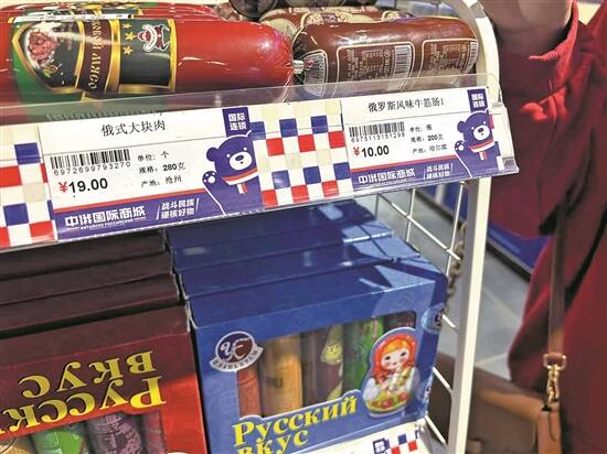 时尚天河“俄罗斯国家馆”内,“俄罗斯风味牛筋肠”产地为哈尔滨 |