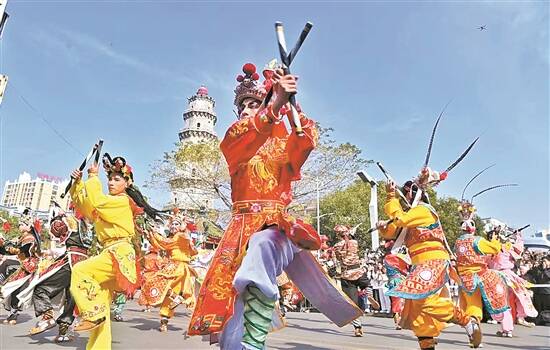 1月22日,潮阳桃园英歌队在文光塔下表演,最前面的表演者为红遍全网的庄恩琪小朋友 |