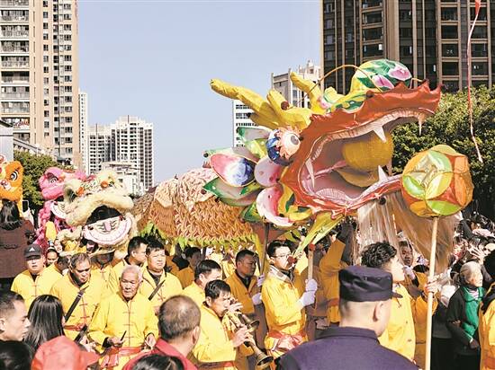 羊城晚报讯 记者欧阳志强、通讯员李思番摄影报道:大年初一一大早,除夕夜的热闹还未褪去,韶关南雄市区又一轮过节大戏开始上演。399米长的九十九节龙在三影塔广场腾跃而起,连同青草狮、舞春牛等非遗项目一起,沿街巡游前行贺新春,现场吸引3万多名市民游客打卡观赏。大家在浓浓的年味中,感受“最炫民俗风”,欢庆首个“世界非遗版”春节。 “咚咚锵、咚咚锵……”当天9时,来自南雄珠玑镇叟里元村的村民在三影塔广场集结,将九十九节龙摆成“乙巳大吉”的造型。随后,锣鼓声响起,身着黄色盛装的舞龙队员们手持龙身舞动巨龙,不断展示扭、挥、仰、摇等多种姿势。极具特色的巨龙或昂首挺胸,或腾跃飞奔,或穿梭盘旋,各有韵味的“游龙戏珠”“神龙下海”招式逐一亮相。特别是经过青云大桥时,巨龙硕长的身躯横跨浈江,从空中俯瞰,宛如“猛龙过江”,河岸的观众不断发出喝彩声。 巡游最后,巨龙来到雄州公园广场表演。在广场中央,巨龙奔跑穿梭、跳跃舞动,并摆出“天下太平”字样,祈求新的一年风调雨顺、国泰民安,场面十分震撼。市民和游客发出连连赞叹,纷纷拿起手机拍下震撼人心的一幕。 “长这么大还是第一次现场观看舞龙,很壮观、很热闹,这才是真正的年味儿。”来自江西南昌的游客刘大姐笑着说,“我是从江西过来的,特别幸运在街上遇到了舞龙长队,队伍非常壮观,九十九节龙特别震撼,看完心情很激动。” 巨龙闹春,传承千年文化。据介绍,九十九节龙发源于珠玑镇叟里元村,长399米,是南雄市县级非遗。在村民代代相传的传说中,早在周朝时期(至今3000多年历史),叟里元人的祖先就齐心协力制作了九十九节龙,有关巨龙的文字记载最早出现在700多年前,村里至今还保留着一块清朝宣统年间的“聚龙古庵”石匾,这也是当年存放九十九节龙的场地留下的实物。 “九十九节龙是南雄人‘异姓一家、同舟共济、勤劳勇敢、开拓创新’精神的集中体现,寄托了南雄百姓千百年来对美好生活至真至诚的追求,此次活动不仅增添了年味,为广大市民和游客营造了一个热闹喜庆、欢乐祥和的节日文化氛围,也展现了南雄作为历史文化名城的独特魅力。”南雄市文广旅体局相关负责人介绍,“接下来,我们将大力传承中华民族的优秀传统文化艺术,做好文化遗产活化利用文章,让民俗闹起来,让群众乐起来,推动南雄文化旅游融合高质量发展。” 南雄市珠玑镇叟里元民间文化艺术协会会长黄德东表示,舞龙不单纯是为了欢乐而舞,更重要的是表达人们的美好祈愿,祈求风调雨顺、五谷丰登。 活动现场,青草狮、舞春牛、舞龙舞狮等民俗巡游也精彩上演,为市民朋友和八方游客献上一场充满南雄特色的民俗文化大戏。青草狮起源于清朝年间,至今已有300多年的历史,与其他舞龙狮表演艺术相比,青草狮道具独特、造型夸张、形神兼备、雄壮威武,有着赞扬劳动人民、庆祝丰收的美好寓意。舞春牛表演包含春牛出栏、春牛上路、春牛背轭、春牛耕田、春牛擦痒、卧地听歌等,弘扬“三牛”精神,表达劳动人民对农业丰收的美好祝愿,以及对未来生活甜美的理想与精神寄托。 为了让更多人“云感受”热闹年味,此次活动还进行了网络直播,全国各地40万名观众一睹巨龙风采,让广东第一长龙通过云端走向全国走向世界。此外,大年初六(2月3日),南雄百顺镇将开展国家级非物质文化遗产——舞香火龙活动,欢迎广大游客到南雄过大年,体验一场“寻龙之旅”。