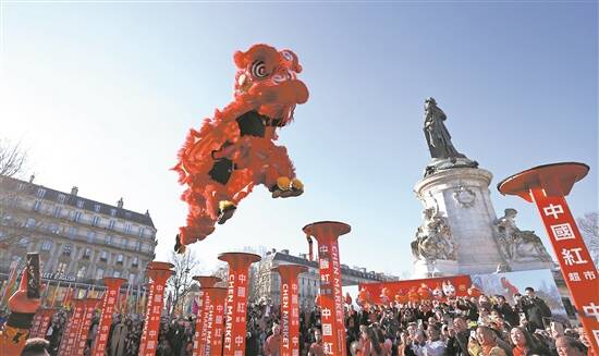 演员在旅法华侨华人春节庙会开幕式上进行舞狮表演 新华社发 |