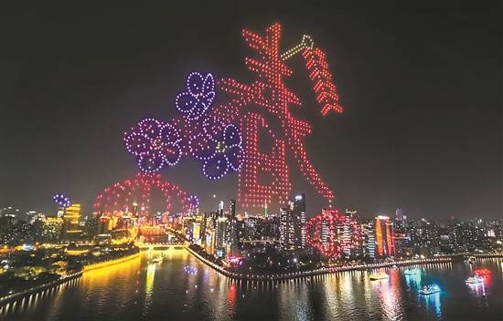 图/东田 文/郭新国 1月29日大年初一,在广州白鹅潭江面,举行了盛大的烟火和无人机表演。图为2025架飞机组成了一个大大的“春”字图案,非常喜庆壮观。 随手拍专用邮箱:ycwbwyb@163.com
