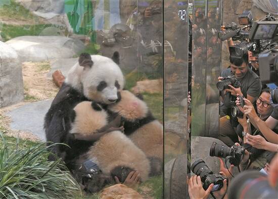 21日,媒体记者拍摄大熊猫“盈盈”和龙凤胎宝宝 新华社发 |