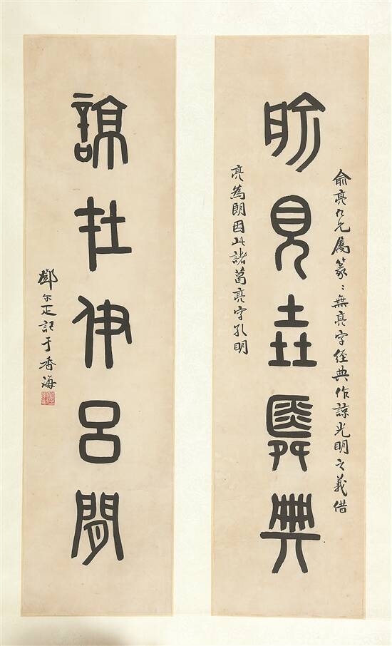 邓尔雅书写的五言篆书联“俞见尧舜典,谅在伊吕间” |