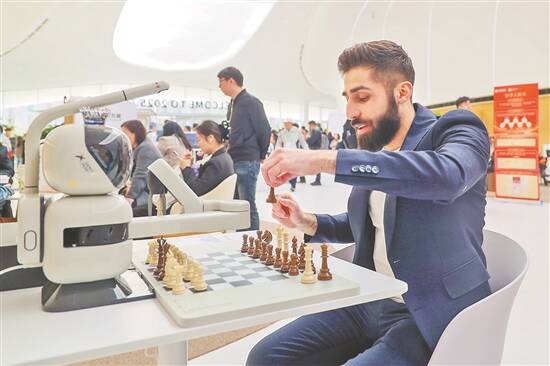 来自巴勒斯坦的参会者与“元萝卜”AI下棋机器人下国际象棋 |