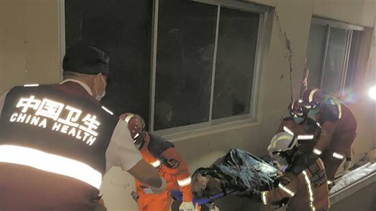 3月30日,在缅甸曼德勒天空别墅公寓建筑群,救援人员营救一名被困孕妇 新华社发 |