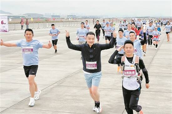 羊城晚报讯 记者宋王群报道:3月30日上午,中国内地首个以机场跑道为主题的路跑活动在深圳机场三跑道举行,来自社会各界3000名跑步爱好者在三跑道旁的海堤入口处起跑,沿着紧邻珠江口的外海堤,踏上新修建的机场三跑道,最终抵达位于三跑道中段的活动终点。 记者了解到,这是深圳机场三跑道自2020年开工建设以来,首次与公众见面。三跑道项目是国家重大项目、广东省重点工程,位于深圳机场二跑道和沿江高速之间,长3600米,宽45米,飞行区按照最高等级4F级建设,能满足各类大型飞机起降需求。今年内,深圳机场三跑道将正式建成。 30日9时,深圳机场三跑道欢乐跑活动正式开跑。 记者现场采访了解到,此次活动共分为5公里和10公里两个组别,跑步路线主要设置在深圳机场三跑道。 现场3000名参与人员中,既有亲身参与三跑道工程的建设者和空港各单位人员,也有不少经常从机场出行的旅客,还有幸运中签的社会跑者。 “我参与了三跑道的建设,见证了这里从松软的泥土变成能够承载大型客机的跑道。今天,我奔跑在跑道上,心里满满的成就感、自豪感。”中国电建深圳机场项目部工程部主任张程文表示。