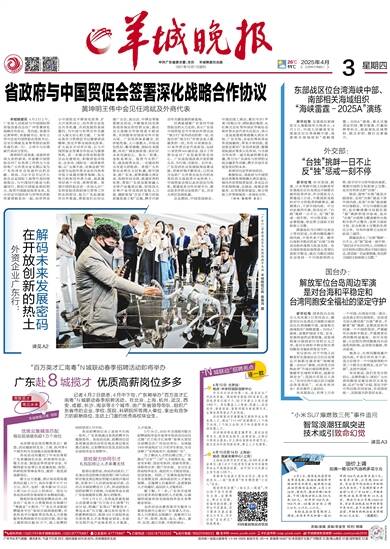 中共广东省委主管、主办 羊城晚报社出版 1957年10月1日创刊 26℃ 11℃ 2025年4月3日 乙巳年三月初六 星期四 责编/袁婧 美编/
