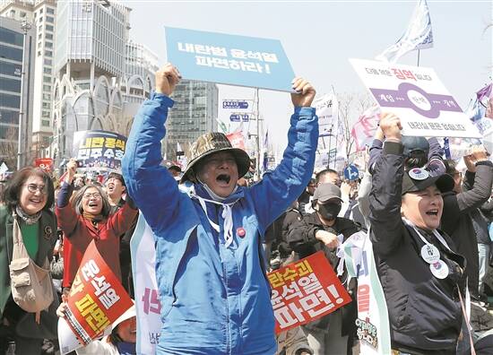4月4日,民众在韩国首都首尔的韩国宪法法院附近庆祝尹锡悦弹劾案获得通过 新华社发 |