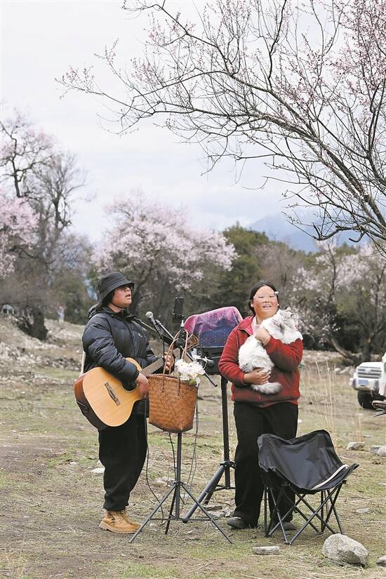 4月4日,富贵(左)和丸子带着一只猫,把车子改装成移动咖啡店,在波密桃花沟的桃树下做起生意 |