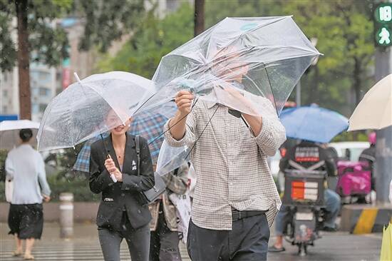行人撑伞雨中前行,一位路人的雨伞被大风吹坏 羊城晚报记者 刘畅 摄 |