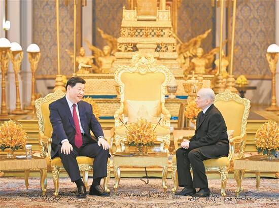 4月17日下午,柬埔寨国王西哈莫尼同中国国家主席习近平在金边王宫举行会见 新华社发 |