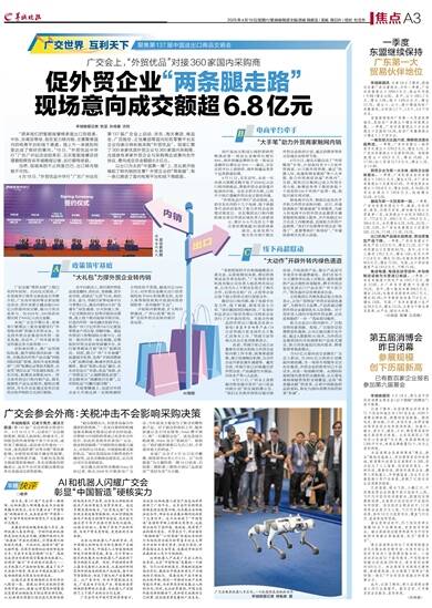 □杨帅 连日来,第137届广交会第一期现场,AI和机器人领域展品成为全球客商瞩目的焦点,全方位展示出“中国智造”的硬核实力,也再度证明“中国第一展”引领市场创新和新质生产力发展的非