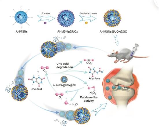 文/羊城晚报记者 陈辉 通讯员 柯佳 图/受访者提供 痛风,是人体内尿酸结晶堆积引发的剧烈关节炎症,严重发作时关节疼痛如刀割、针刺、火烧般深入骨髓,已累及全国超8000万患者。传统药物治疗虽能降解尿酸缓解症状,却像“灭火器”只能扑灭明火,无法清除隐患,尿酸降解后产生的过氧化氢更像“余烬”,长期损伤关节,甚至引发心血管疾病。更棘手的是,人体自身早已失去分解尿酸的“工具”——尿酸酶(UOx)。如何设计一个既能高效降解痛风患者体内尿酸、又能自动清理“余烬”的智能系统?这成了全球医学科研者竞逐的难题。 南方医科大学药学院涂盈锋教授团队构建了一种负载有柠檬酸钠和尿酸酶的中空介孔二氧化硅“纳米马达”,作为可移动的能量转换器件,用于痛风安全高效的主动治疗,也成为全球首个利用二氧化硅“纳米马达”开展痛风主动治疗的研究,该研究成果近日发表于《自然通讯(Nature Communications)》。 在纳米世界打造“自我升级的机器人” 传统痛风治疗长期面临疗效与副作用并存的困境,非甾体抗炎药和秋水仙碱虽能缓解急性发作,但长期使用易引发胃肠道损伤和肝肾毒性;别嘌醇等降尿酸药物存在超敏反应风险,部分患者经常被迫中断治疗。同时,严格的低嘌呤饮食控制常因执行困难而疗效打折,而间歇性治疗模式又导致患者血尿酸波动,反而加剧尿酸结晶沉积。这种"止痛易、治本难"的现状,迫使医学界持续探索更精准安全的治疗策略。 在摸索研究中,涂盈锋团队成员偶然注意到蜜蜂采蜜时会释放信息素引导同伴,形成高效的“群体作业”。这启发了团队有了“纳米蜂群”的大胆设想,能否设计一种能在人体关节内自主运动的纳米颗粒,携带人体匮乏的降解尿酸的酶,像一只只小蜜蜂一样,在关节内自主协作,精准“围攻”尿酸结晶?于是,可负载柠檬酸钠和尿酸酶的中空介孔二氧化硅“自驱动纳米马达”的概念诞生了,它就像一台微型机器人,在人体关节腔内一边“吃掉”尿酸,一边将有害的降解产物过氧化氢转化为无害的水和氧气,形成自给自足的“能量循环链”。 “我们不是单纯在制造尿酸酶纳米颗粒,而是在纳米世界实现微小颗粒的自主运动。”团队主创成员刘璐表示,要让尿酸酶纳米颗粒在关节腔内自主运动“扫除”尿酸和降解产物,就必须赋予纳米颗粒较快的运动速度。 “纳米马达”自主运动的核心是硅壳的不对称孔洞,但因为初期合成的孔洞要么太大(>150 nm),颗粒易碎裂,要么太小(<50 nm),离子梯度推力不足。团队反复尝试不同配比的溶胶-凝胶反应,最终将孔径稳定在85.8 ± 21.3 nm,这相当于头发丝直径的千分之一。 “纳米马达”穿上了“硅壳铠甲” 最初研发的“纳米马达”像无头苍蝇般,只能随机移动(布朗运动),效率极低。团队研究发现尿酸降解会产生离子梯度,就像火箭喷射气体产生推力一样。利用这一原理,团队在纳米颗粒表面“凿”出一个不对称的孔洞(类似火箭尾喷口),让纳米颗粒能像赛车一样自主加速,使其运动速度提升了近3倍。由于纳米颗粒表面孔洞的大小和位置需精确到纳米级,为实现其稳定量产,团队还反复尝试了上百种硅壳合成工艺,最终通过“一步法”化学合成实现了目标。 尿酸酶非常脆弱,如何防止高温、酸性、蛋白酶随时可能对尿酸酶的摧毁?团队为“纳米马达”特别设计穿上了“硅壳铠甲”,通过表面氨基包裹,来修饰固定酶分子。通过实验发现,包裹后的尿酸酶在70℃高温下仍保留46%活性,抵御蛋白酶的能力提升了2.5倍。这相当于给士兵穿上防弹衣,让它们在恶劣环境中也能持久作战。 目前,负载柠檬酸钠和尿酸酶的“纳米马达”在动物实验模型中已展现卓越疗效,关节损伤修复率超90%,且无副作用。下一步,团队将推进临床试验,通过将“纳米马达”注射进人体关节腔,在5年内实现痛风患者 “一针治疗”的目标。从更长远看,“纳米马达”的技术还可拓展至其他代谢性疾病,例如运用葡萄糖驱动的“纳米马达”治疗糖尿病,或用胆固醇降解酶对抗动脉粥样硬化,“主动纳米医疗”的时代正在到来。