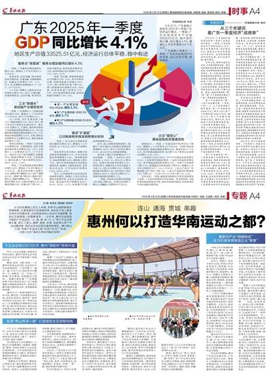 □羊城晚报记者 杨帅 4月22日,广东省统计局发布2025年一季度广东经济运行情况。一季度,广东实现地区生产总值33525.51亿元,按不变价格计算,同比增长4.1%,增速比上年全年提高