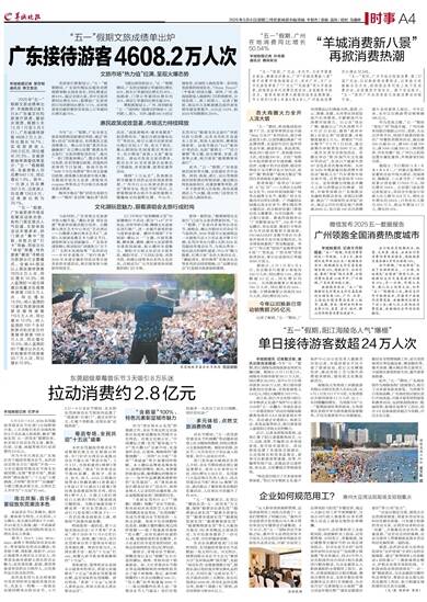 羊城晚报记者 黎存根 通讯员 粤文旅宣 2025年“五一”假期文旅成绩单出炉,羊城晚报记者5日从广东省文化和旅游厅获悉,据初步测算,假期5天(5月1日至5月5日),广东省接待