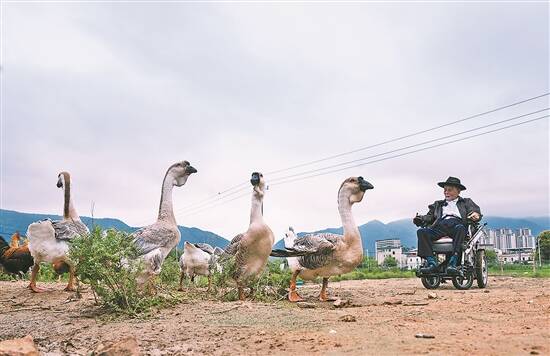 文/图 羊城晚报记者 邓勃 题字/何世良 石窟河畔,村巷田野,谢指南老人已成为这片土地上最动人的风景。在“长寿之乡”广东省蕉岭县,这并不稀奇。 清晨的第一缕阳光穿透薄雾,温柔地抚过蕉岭县长潭镇上村村的乡间小路。远处传来一阵轻快的电动马达声,村民们不约而同地停下脚步,脸上绽放出会心的微笑——谢爷爷又要开始他一天的“巡游”了。 “公太出行,请回避咯——”村里的孩子们蹦跳着为老人开道,清脆的笑声在晨光中回荡。“公太”是客家人对曾祖父的称呼。104岁的谢指南老人,早已成为这片土地上最动人的风景。每天清晨,他都会准时发动他的“座驾”——那辆陪伴自己多年的电动轮椅车,在他守护了一个多世纪的家园里,又迎来了新的一天…… 谢老出生于1922年7月,今年虚岁刚好104岁。年轻时靠务农谋生,膝下有四个儿子。百年沧桑,经历过无数的艰难与磨难,如今,四世同堂,尽享晚年之乐。这个岁数的老人家在蕉岭县并不稀奇。 “在蕉岭县,不论在哪个山旮旯里,就算是一条小小的村子,遇到老人,说不定已经年过百岁了……” 谢老的二儿子谢友喜认为,父亲心地善良,乐于助人,与其他老人不一样。他觉得父亲活得就像一个孩子,一天到晚都是笑呵呵的。人家问他长寿的秘诀是什么,他从不正面回答,总是以笑代之,一脸的自信与乐观。 老人每天总是穿着熨烫妥帖的西装,皮鞋擦得锃亮,小帽端正地戴在银发上。阳光为他镀上一层金边,连皱纹里都盛满了温暖的光。热爱生活,成了老人家的一种美德。 “老爷子可是我们村的‘活地图’,谁家菜地种了什么,哪条小路最近修过,他都门儿清。”村民们说起谢爷爷,眼里满是敬佩。从晨曦微露到暮色四合,这位“老司机”每天要行驶七八公里,把村里的每个角落都装在心里。 勤快与热心是老人家的长寿秘诀。老人104岁了,他却一点都不显老,利落地弯腰查看菜苗的样子,依然不减当年,切菜喂鹅的那个有力干脆敏捷的动作,依然“老到熟练”,不拖泥带水;下雨了,他也闲不住,披着雨衣依然要照常外出"巡逻"。来到市场上,遇到卖不完菜的摊主,二话不说就答应人家,“菜我全部买下了”。二儿子谢友喜笑着说:“父亲这辈子就闲不住,现在年纪大了,反而管得更宽了。”在老人心里,劳动就是最好的锻炼身体,帮助别人从来不是负担,而是生命中最甜蜜的馈赠。 当熟悉的电动轮椅车,辗着水泥路发出一串清脆的声响,由远及近,村民们就知道:热心的谢爷爷送温暖来了,送“开心果”来了。 这位跨越世纪的老人,把对生活的热爱都藏在生命的每一个细节里。他坚持自己穿衣打扮,拒绝儿孙们的帮助。“阿妹,我自己来!”当孙女想帮他系纽扣时,老人总会这样“抗议”。这份倔强的独立,或许正是他长寿的又一个密码。 晚餐时分,四世同堂的餐桌上,老人夹起一块海鱼,眼里闪烁着满足的光芒。 “每餐两碗白粥,最爱吃海鱼。”谈起养生,老人笑得像个孩子。潮汕长大的经历让他对海鲜情有独钟,但更珍贵的,是他那颗永远年轻的心。“有什么想法都跟儿孙们说,不憋在心里。”这份豁达,让他的百岁人生始终充满乐观和欢声笑语。 夕阳把影子拉得很长很长,老人坐在小广场边看村民下棋,曾孙们在他膝前嬉戏。晚风轻拂,带来阵阵稻香。 “活到这把年纪,还能看到曾孙满地跑,值啦!”望着村里新建的活动室和平整的村道,谢指南的眼中泛起温柔的光。从战火纷飞到盛世繁华,他见证了这片土地上一个世纪的沧桑巨变。 突然,老人调皮地冲镜头眨眨眼,电动轮椅车“嗖”地驶向远方,留下一串欢快的喇叭声,仿佛在说:看吧,自信人生一百年,还当击水三千里……