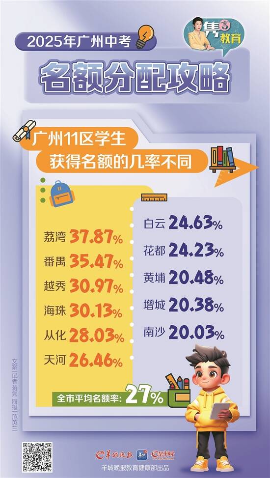 羊城晚报记者 蒋隽 广州进入中考人数持续攀升时代,今年再增1万人,增在哪些区?名额分配是中考最大“福利”政策,11区获得名额“上岸”普高的几率有何不同?11区普高最低录取分可相差上百分,不同区考上普高的难易有多不同?而小学与初中强相关,在哪里买房读书大有讲究。“隽言教育”从考生人数、名额几率、各区分数、入学政策等全方位视角,倒推如何系好“买房”这第一颗求学路上的“纽扣”,让娃的升学路顺畅一些? 考生增加在哪些区? 广州正处于长达十几年的中考人数持续上升时代。未来9年,广州普高学位都将处于供应紧张状态。广州市教育局数据显示:2023年广州小学入学人数27.2万人,较2022年多了约6万人,达到“入学最高峰”;这27万人的入学高峰将逐年向后续年级传导,预计2029年迎来初中入学高峰年,初中总体在校生人数高峰将出现在2031年;预计2032年迎来高中入学人数高峰,高中总体在校人数高峰将出现在2034年。 不同区对考生的消化能力、能提供的教育资源也是不同的,因此细化分析中考人数增加在哪些区,非常重要。 名额分配基本可以理解为户籍生“上岸”普高的最大“福利”。因为只要在同一初中有三年完整学籍的应届户籍生(含政策照顾),即自动享有名额生资格,不必自己报名,中考系统自动认证。因此,各区名额生人数的增减基本可视为该区中考考生的变化。 羊城晚报记者统计发现,今年全市符合名额分配资格的考生为102785人,2024年是92262人,增加了10523人。 2025年5个区的名额生人数突破万人,分别是:番禺14535人、增城13022人、花都10560人、白云10773人、天河10027人。6000人以下的只有2个区,分别是从化5998人和荔湾5817人。而2024年名额生人数突破万人的区只有2个、2023年只有1个。 再看变化,今年所有区的名额生都增加。增加最多的是增城,增2060人;其次是黄埔,增1356人;随后是白云,增1186人,花都增1131人,番禺增1121人,从化增996人,南沙增929人,天河增868人;增幅较小的是老三区,越秀增329人,荔湾增288人,海珠增278人。 分析数据可见,名额生增幅最大的区都是周边区域,传统中心城区增长势头没有周边区域强劲。尤其需要注意的是增城和花都,基数大、增幅大,传统教育基础又比较薄弱,再面临考生的高增长,挑战较大。 对于番禺、白云、天河来说,虽然考生人数也破万,但这三个区长期以来都是人口导入大区,且这三个区的GDP在广州位于前列,可能有更大的转圜余地应对考生的增加。 名额率荔湾番禺最高 2025年,全市符合名额分配报考资格考生数102785人,名额分配计划27794个。全市名额生获得名额的几率为27%,即约3.7个学生竞争1个名额。 简单来说,“名额分配”就是优质高中将50%的招生名额随机平均分配给全市的初中,让考生以该校过往三年录取平均分降低40分的成绩录取。所以是中考最大的“福利政策”,也是户籍生“上岸”优质普高的最主要途径。 省市属学校的名额全市初中平均分配,但区属普高的名额只在区内分配,因为每个区参与名额分配的区属普高数量和考生数量各不相同,因此各区名额率也有所不同。 2025年,广州11区考生获得名额的几率从高到低排序为:荔湾37.87%、番禺 35.47%、越秀30.97%、海珠30.13%、从化28.03%、天河26.46%、白云24.63%、花都24.23%、黄埔20.48%、增城20.38%、南沙20.03%。 2024年,广州11区名额率从高到低排序为:番禺37.0%、荔湾36.0%、越秀31.1%、从化29.0%、海珠27.8%、花都26.6%、天河26.5%、白云26.2%、黄埔22.8%、增城22.8%、南沙21.3%。 2023年,11区名额率从高到低排序为:番禺35.8%、荔湾34.5%、从化31.9%、越秀29.8%、花都26.9%、白云26.8%、海珠25.4%、天河25.3%、增城25.0%、黄埔19.5%、南沙16.9%。 对比发现,荔湾和番禺一直是户籍生靠名额分配考入普高机会最大的区,而且今年荔湾超越番禺;越秀、海珠、从化紧随其后,都高于全市平均几率;天河、白云、花都、黄埔、增城、南沙低于全市平均几率。 11区考上普高难易不同 广州11区能考上普高的最低分也是不同的。 2024年,11区公办普高最低录取分数分别为:越秀622分、海珠622分、天河610分、荔湾608分、黄埔542分、番禺542分、白云542分、南沙542分、花都542分、增城542分、从化502分。分差可以达到100多分。 各区招生政策存在变化 还有一个重要维度,是出生人口下行后的义务教育阶段招生政策的变化。 今年4月,广州11区先后出台的义务教育阶段招生细则显示:南沙区非户籍人士买房送学位;学位需求压力向初中传导;即便入学人数减少,优质学校的学位依然被追捧,天河区教育局发布华阳小学、龙口西小学、天府路小学、体育东路小学兴国学校、旭景小学等13所小学的招生预警。 综合分析 升学布局需考虑整体教育格局 综合分析以上几个维度,学位房依然是求学路上的“第一颗纽扣”,在哪个区域买房、读书,依然对孩子的升学道路有重大影响。 从近几年的综合表现来看,广州教育格局处于东部崛起、中心区域平稳、周边区域攀升、个别区域波动起伏的动态变化之中。 对于黄埔来说,经济与科技实力强劲,新兴产业聚集,人口与生源素质优势将逐步显现,近年来教育投入大、新学校多。黄埔教育“弯道超车”势头明显,假以时日必将成为广州教育的重要力量。 天河需要在提质与增量之间做好平衡。未来近十年,初中、高中学位还面临一段长时间的紧缺。但天河已经没有土地优势,相当部分成熟甚至