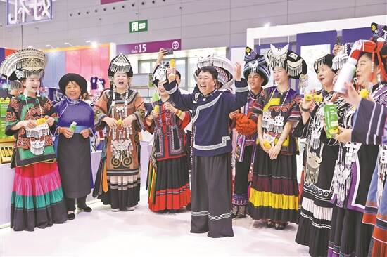 文博会多彩贵州展位身着民族特色服饰的工作人员通过对山歌的形式为当地特色刺梨饮料产品做推广 羊城晚报记者 王磊 摄 |