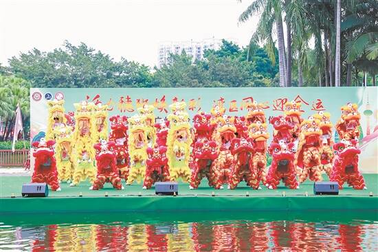 6月2日是端午假期最后一天,第九届广州青少年醒狮表演赛启动仪式暨荔湾区选拔赛在广州荔湾湖公园水上舞台震撼开演 主办方供图