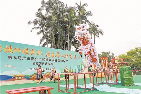 羊城晚报讯 记者周欣怡、朱绍杰报道:6月2日是端午假期最后一天,荔湾湖公园内锣鼓喧天、热闹非凡。龙舟竞渡余温未消,醒狮盛会又掀热潮——第九届广州青少年醒狮表演赛启动仪式暨荔湾区选拔赛在荔湾湖公园水上舞台震撼开演。醒狮少年矫健的身姿与铿锵的鼓点相得益彰,引得围观的市民游客连连喝彩。 活动由广州市文化广电旅游局主办,广州市龙狮协会、广州市文化馆(广州市非遗保护中心)承办,荔湾区文化广电旅游体育局协办,旨在高质量推动国家级非遗代表性项目广东醒狮的传承发展,促进其在青少年群体中的普及推广,为第十五届全国运动会(以下简称“十五运会”)营造激情、活力、喜庆、热烈的氛围。 据广东醒狮国家级代表性传承人、广州市龙狮协会会长赵伟斌介绍,本届广州青少年醒狮表演赛以“活力穗狮焕新彩,湾区同心迎全运”为主题,以国家级非遗项目广东醒狮为载体,展现广州“雄狮少年”蓬勃向上的精神风貌,助力粤港澳大湾区文化共融,为即将到来的十五运会贡献广州醒狮力量。 活动在15位广州醒狮鼓乐手擂动15面金鼓的磅礴气势下拉开帷幕。启动仪式上,56位来自粤港澳大湾区的学子舞动28头醒狮呈现创意节目《湾区雄狮迎全运》,28头醒狮摆出“十五”字样,象征着56个民族紧密团结,共同迎接十五运会的到来。 首场赛事——荔湾区选拔赛同场举行,9支荔湾区内青少年醒狮精英队伍同台竞技,争夺全市决赛入场券。 记者获悉,第九届广州青少年醒狮表演赛将在6月至8月持续开展。赛事分为“非遗醒狮少年”个人才艺大赛和青少年醒狮表演赛两个板块。其中,个人才艺大赛分为线上视频投稿和线下现场比赛两个环节,线下现场比赛将于6月14日(“2025年文化和自然遗产日”期间)在陈家祠广场举行。 青少年醒狮表演赛分为群狮和单狮两个比赛项目,由各区初赛选拔出优秀队伍参加全市决赛。总决赛定于8月9日-10日在广州市文化馆中心阁前广场举行。