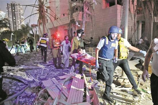 在以色列佩塔提克瓦的导弹袭击现场,救援人员转移一名女子 新华社发 |