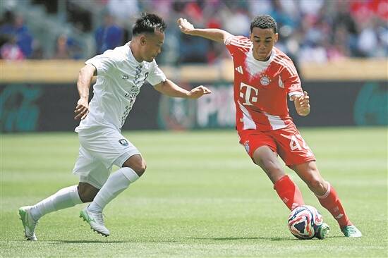 奥克兰城队球员周通(左)与拜仁慕尼黑队球员穆夏拉拼抢 新华社发 |