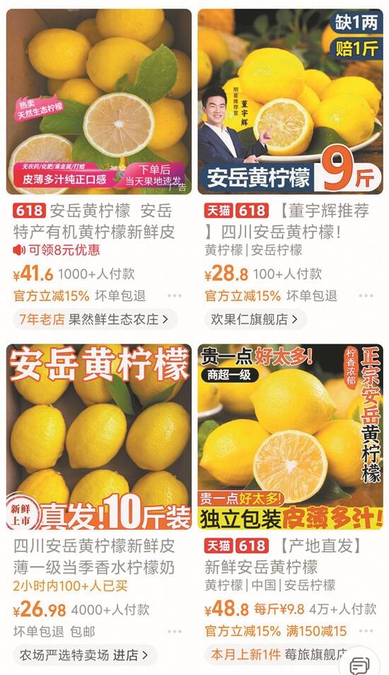 某电商平台上安岳黄柠檬的价格普遍接近十元/斤 |