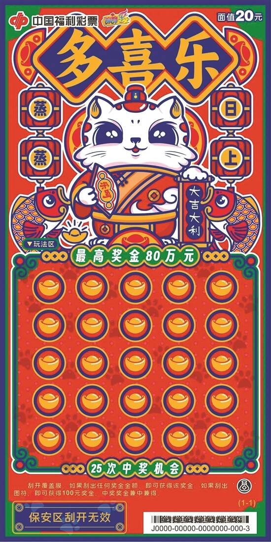 近日,寓意欢乐祥和、福运满盈和生活美满的刮刮乐新票“多喜乐”隆重上市,购彩者可到广东各大福利彩票销售点尝鲜。 刮刮乐新票“多喜乐”采用国潮风设计,以红色为主色调,搭配蓝色和黄色,色彩鲜艳,充满喜庆氛围。本次上市的新票有10元、20元两种面值,最高奖金分别为30万元、80万元。“多喜乐”玩法简单,刮开覆盖膜,如果刮出任何奖金金额,即可获得该奖金;如果刮出“钱袋”图符,即可获得100元奖金。中奖奖金兼中兼得。 刮刮乐凭着玩法简单、即刮即中、返奖率高等优势,成为年轻人的新选择。随手一刮,梦想未必开花,但您购买的每张福利彩票,都是为社会福利和公益事业贡献力量。福彩刮刮乐公益金提取比例是20%,也就是说,一张20元的福彩刮刮乐,就有4元拨入福彩公益金。筹集到的公益金,被广泛用于“扶老、助残、救孤、济困”等公益领域。(文/图 黄颖琳 粤福彩)
