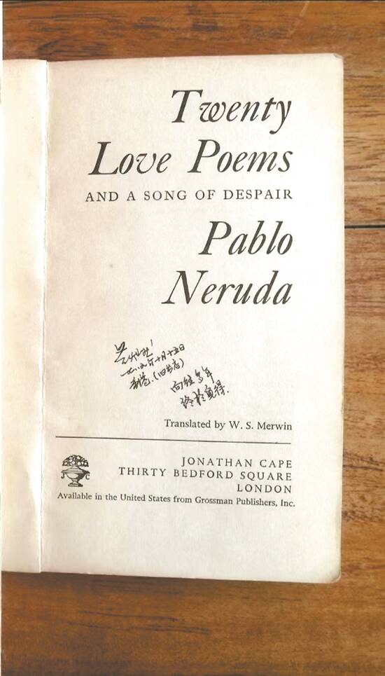 美国诗人默温译的聂鲁达《二十首情诗和一首绝望的歌》。不是什么珍藏,但这是1989年10月在香港旺角旧书店捡到的。扉页上写着“向往多年,终于觅得” |