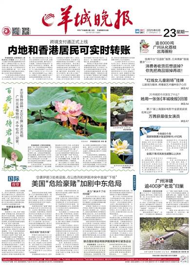 中共广东省委主管、主办 羊城晚报社出版 1957年10月1日创刊 2025年6月23日 乙巳年五月廿八 星期一 35℃ 26℃ 责编/袁婧 美编/刘栩