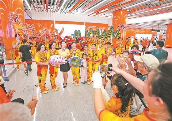 羊城晚报记者 严艺文 孙牧 通讯员 温美春 张晨牧 刘艾玲 6月29日,广州城市轨道交通线网骨架中的“X形”对角线——10号线(杨箕东至西塱)、12号线东段(二沙岛至大学城南)及西段(浔峰岗至广州体育馆)正式开通初期运营。据悉,广州地铁线网运营里程达到751.1公里,在大湾区运营的轨道交通总里程超过1100公里。 开通前已有不少街坊等待 当日11时许,在10号线杨箕东站,杨箕村组织了舞龙舞狮队伍为10号线开通助兴。在1号线西塱站换乘10号线的通道入口,聚集了数十位市民等待开通。黎阿姨特意举着“10号线、12号线顺利开通”的牌子拍照留念。她兴奋地说:“我住在海珠,特意到西塱站坐10号线,想体验乘坐首班车。” “地铁迷”关同学带着他手绘的地铁线网图来到现场,不同线路不同站点的精细描绘让街坊们惊叹。“我花了两天时间完成手绘,包括广州地铁线网和广东城际的运营线路,今天想带着手绘图坐完新线体验。” 12时,10号线,12号线东段、西段正式开通。10号线西塱站启用了新换乘通道,乘客通过新增的扶梯以及垂直电梯,更加舒适便捷地换乘一号线、广佛线,与之前的临时换乘通道相比,时间缩短2分钟左右。 五羊邨站则采取与琶洲站一样的临时站外换乘方式。在E、F口设置了蓝色换乘专用闸机与普通出站闸机加以区别,工作人员在现场引导换乘乘客。30分钟内在另一线路蓝色换乘专用闸机进站,计费等同于站内换乘。记者体验测算,从五羊邨10号线E口到5号线D口约230米,从五羊邨10号线F口到5号线A口约270米,换乘耗时约6分钟。 12号线实现了与国铁广州白云站的站内便捷换乘。在广州白云站,记者看到地铁F、G、H口为乘坐地铁免安检通道,从国铁广州白云站出站的乘客可按照出站层指引,免安检直接进入地铁广州白云站;乘坐地铁前往广州白云站的乘客无需出站,步行5分钟左右即可到达国铁广州白云站。 为庆祝两条新线开通,广州地铁在10号线、12号线推出 “游、悦、享”主题活动,通过主题展览、音乐沙龙、互动活动以及车站环境美化布置等,营造喜庆的开通氛围。 年底将新建成开通7条线路 广州地铁集团党委书记、董事长刘智成当日在开通活动现场表示,10号线与12号线,共同构成广州城市轨道交通线网骨架中的“X形”对角线,连通越秀、荔湾、天河、白云等多个行政区,串联重要文体场馆、商务区及交通枢纽等多元生活场景,衔接广佛线、22号线等多条线路和广州白云火车站,完善广州“环形+十字+X形”的城市轨道交通结构,进一步强化广州中心城区与外围组团的经济联系。 刘智成透露,广州地铁在今年年底将新建成开通7条、共128公里地铁和城际线路,珠三角城际铁路实现成网运营。
