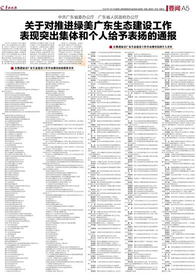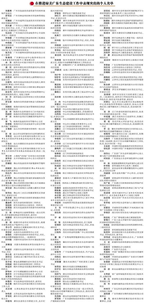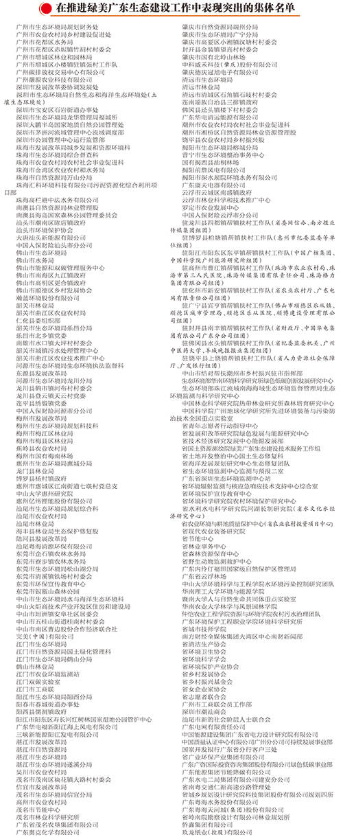 《中共广东省委关于深入推进绿美广东生态建设的决定》实施以来,全省上下坚持以习近平新时代中国特色社会主义思想为指导,深入贯彻习近平总书记对广东系列重要讲话和重要指示精神,认真落实省委“1310”具体部署,深入实施绿美广东生态建设“六大行动”,大力推进乡村绿化、发展绿美经济、助力乡村振兴,深入打好污染防治攻坚战,持续推动发展方式绿色低碳转型,着力提升生态系统多样性稳定性持续性,扎实推进“双碳”工作,推动绿美广东生态建设取得丰硕成果,涌现出一大批表现突出、成绩优异的集体和个人。为进一步激发全省上下推进绿美广东生态建设的工作热情,经省委、省政府同意,对在推进绿美广东生态建设工作中表现突出的广州市生态环境局规划财务处等200个集体和刘夏青等200人给予通报表扬。希望受到表扬的集体和个人再接再厉,进一步发挥模范带头作用,在新征程再立新功。 耕者下力,即是福田。全省各地区各部门要深入学习贯彻党的二十大和二十届二中、三中全会精神,全面贯彻习近平生态文明思想,牢固树立和践行绿水青山就是金山银山的理念,苦干实干、争先创优,加快推进绿美广东生态建设,持续推动生态优势转化为发展优势,不断厚植广东高质量发展绿色底色,努力打造人与自然和谐共生的绿美广东样板,为广东在推进中国式现代化建设中走在前列作出新的更大贡献。