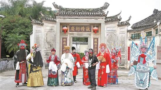 在广东大埔百侯古镇,记者邓勃(左5)与汉剧艺术家们共同演绎了一场文化传承的盛宴 |