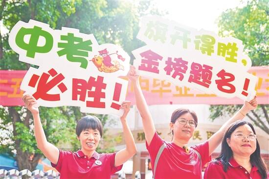 今年广州中考首日,老师们手持祝福标语送考 羊城晚报记者 梁喻 摄(资料图) |