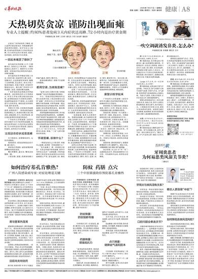 羊城晚报记者 陈辉 王沫依 通讯员 白恬 张佳屏 潘曼琪 记者从广州多家医院了解到,进入夏季后因过度贪凉,导致面瘫发作的患者明显增多。医学专业人士提醒,约80%患者发病3天内症状达