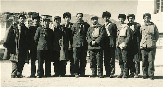 随中央代表团入藏的七位艺术家于 1965 年冬在拉萨合影。刘济荣(左四)、杜英信(左五)、牛文(中)、姚耕云(右四)、其加达瓦(右三)、梁世雄(右二)、李焕民(右一) |