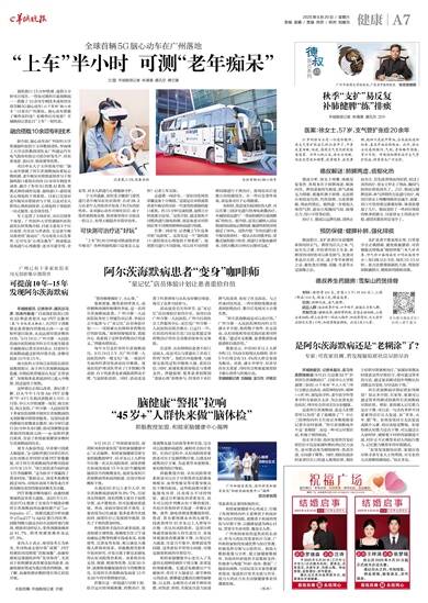 羊城晚报讯 记者张华,通讯员马彦、伍晓丹报道:“目前我们医院已经有22例患者使用Aβ-PET显像剂(氟^18F贝他苯注射液),在PET下清晰锁定患者脑内的致病元凶——β-淀粉样蛋白斑块,从而