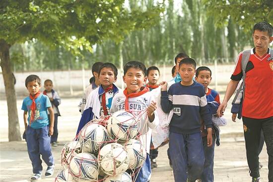喀什的学生收到足球作为礼物 |