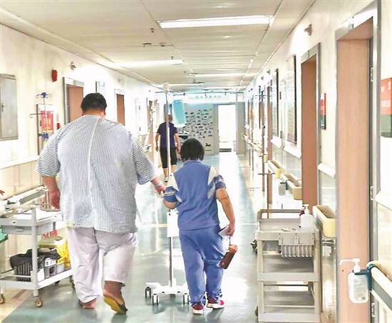 金花特意去病房看望580多斤的小李,陪他一起练习下地活动,给他减重的信心 |