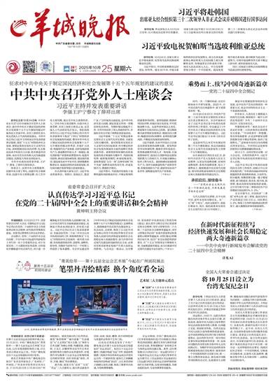 中共广东省委主管、主办 羊城晚报社出版 1957年10月1日创刊 19℃ 28℃ 2025年10月25日 乙巳年九月初五 星期六 责编/徐雪